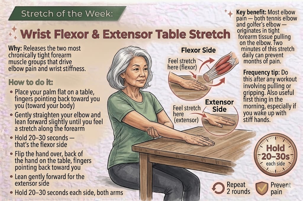 Why it matters: Most elbow pain — both tennis elbow and golfer’s elbow — originates in tight forearm tissue pulling on the elbow. Two minutes of this stretch daily can prevent months of pain.